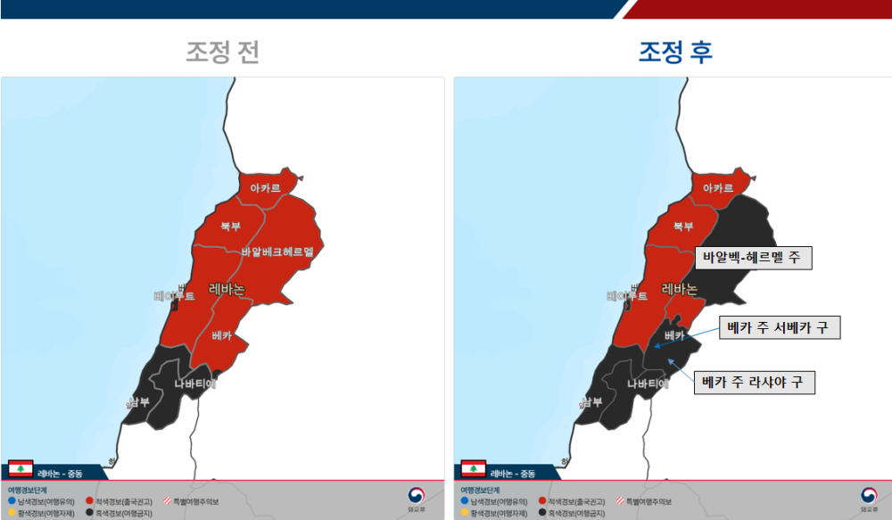 레바논의 경우 바알벡-헤르멜 주, 베카 주 서베카 구 및 라샤야 구 지역이 한국시간 3.20.(금) 20시부로 여행경보 4단계(여행금지) 지역으로 추가 지정됩니다.